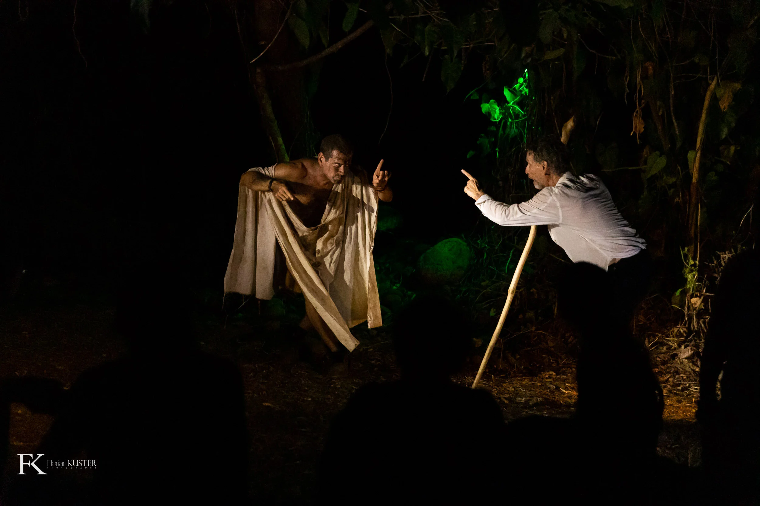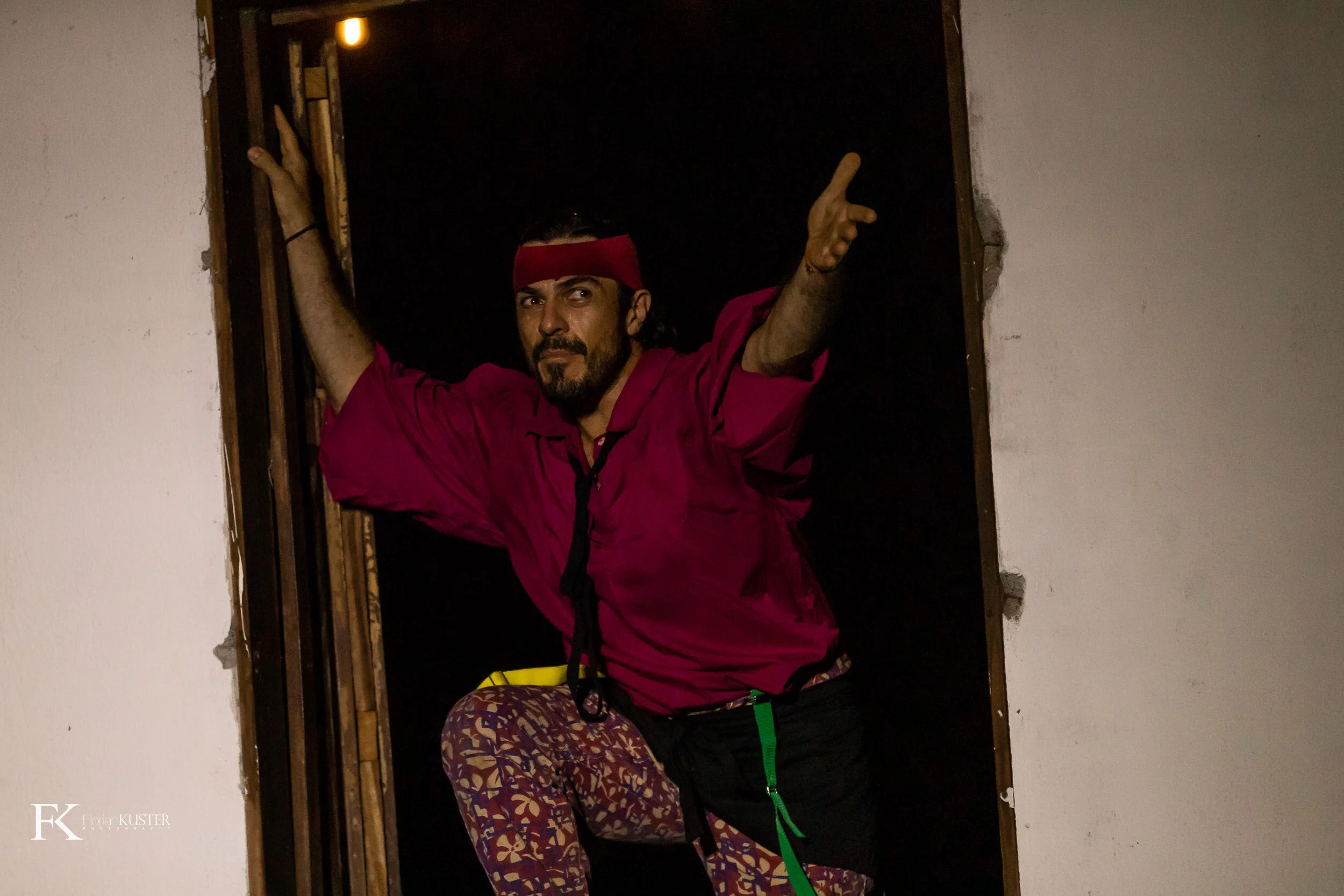 The rehearsal period happens during a residency. Actors and director live, eat, sleep, train and rehearse in one continuous process over a period of weeks. This maximizes the time of creation, focuses the intentions of the participants and allows for creative expressions that could not have existed otherwise. Actors train as a group in physical, vocal and rhythmic exercises alongside the needs of the show. They also participate in cleaning, managing and care taking the space.